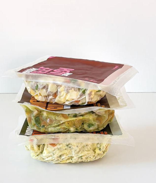 Food-grade fresh pet foods can be vacuum packed or packaged in trays with Modified Atmosphere (Gas Flush). Vacuum packaging extends the life of your product. This affordable packaging option uses a clear film to show off your quality product while securely protecting it from contaminates.