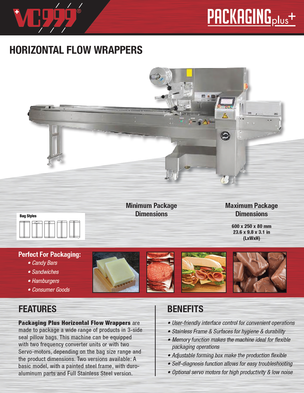 The HFC Series Horizontal Flow Wrapper is made to package a wide range of products in 3-side seal pillow bags. This machine can be equipped with two frequency converter units or with two Servo-motors, depending on the bag size range and the product dimensions. Two versions available: A basic model, with a painted steel frame, with duro-aluminum parts and full Stainless Steel version.