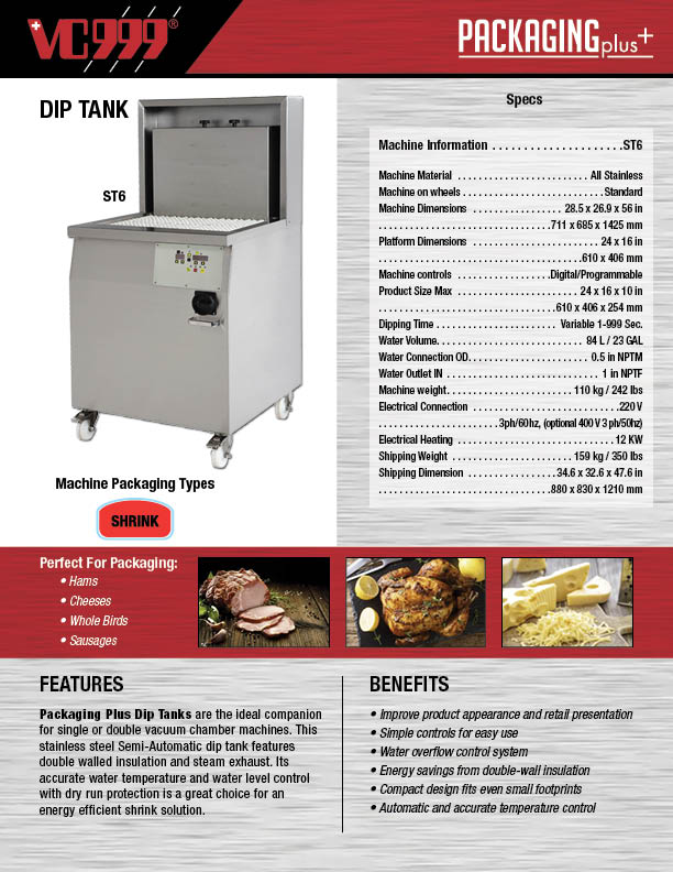 The ST6 Shrink Tank is the ideal companion for single or double chamber machines. This stainless steel Semi-Automatic dip tank is perfect for small to medium packaging operations for many products.