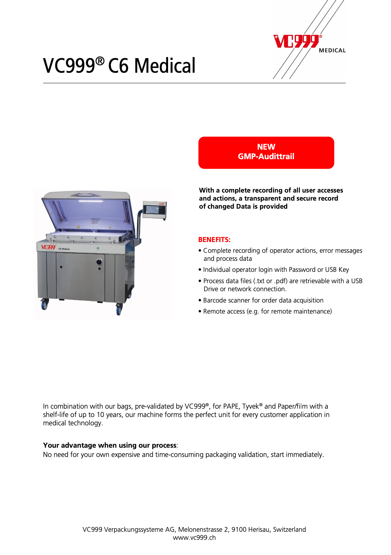 The C6 is designed specifically for optimal efficiency under the cleanest medical production conditions. It is suitable for laboratories, research, and device packaging. In combination with our pre-validated bags with a shelf life of up to 10 years, our machine is the perfect unit for every customer application in medical technology.