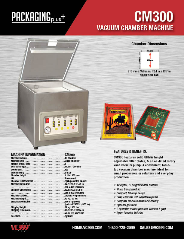 The CM300 Food Packaging Vacuum Chamber Machine is ideal for smaller, flexible everyday production. Typically selected by butcher shops, hotels, restaurants, institutions, grocery stores, R & D Laboratories. These table top single chamber machines are perfect for vacuum packaging your product to extend shelf life, prevent freezer burns and to maintain your product in a controlled atmosphere.