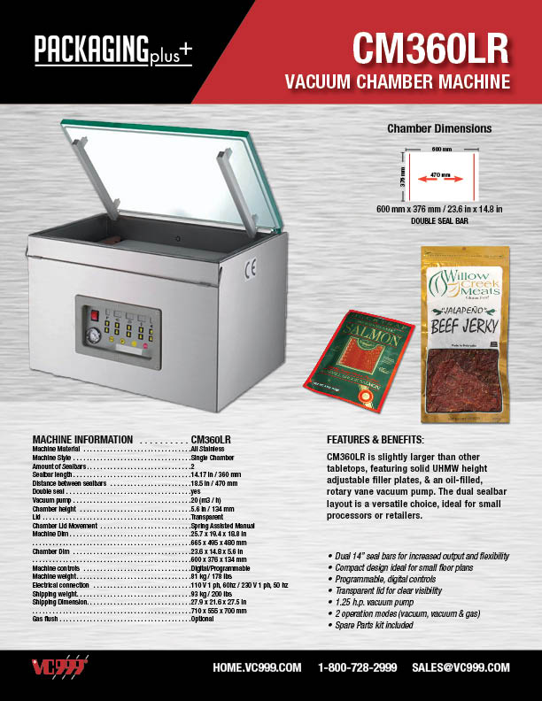 The CM360 Food Packaging Vacuum Chamber Machine is ideal for smaller, flexible everyday production. Typically selected by butcher shops, hotels, restaurants, institutions, grocery stores, R & D Laboratories. These table top single chamber machines are perfect for vacuum packaging your product to extend shelf life, prevent freezer burns and to maintain your product in a controlled atmosphere
