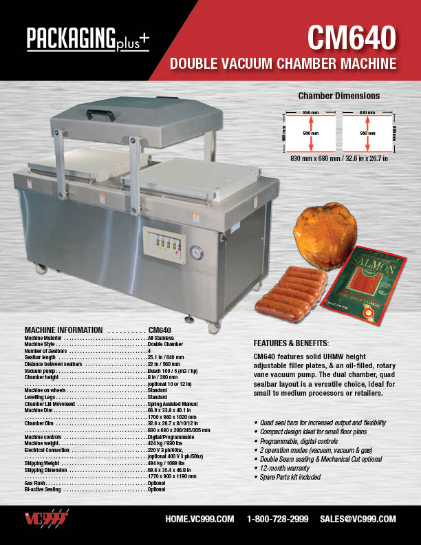 The CM640 features solid UHMW height adjustable filler plates, & an oil-filled rotary vane vacuum pump. A convenient, durable vacuum chamber machine, ideal for medium processors or retailers for everyday production.