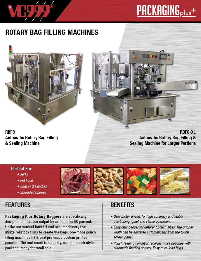The RBF8D is a Duplex automatic rotary bag/pouch filling machine. This duplex machine runs 2 bags (fills 2 pouches at the same time) per cycle. Rotary filling and sealing machines can fully automate the filling and packaging portion of your manufacturing process. The RBF8D uses vacuum and rotary technology to fill pouches, then extrude air from the package, and sealing the bag to finish.